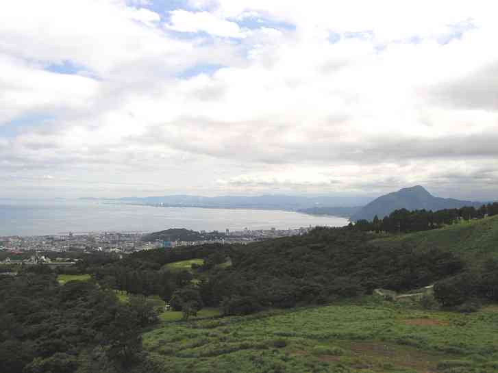 底辺を歩き終わると、へびん湯へと 通じる林道に合流してホットする。 展望も開けてきて、高崎山、別府湾が 良く見渡せる。 |