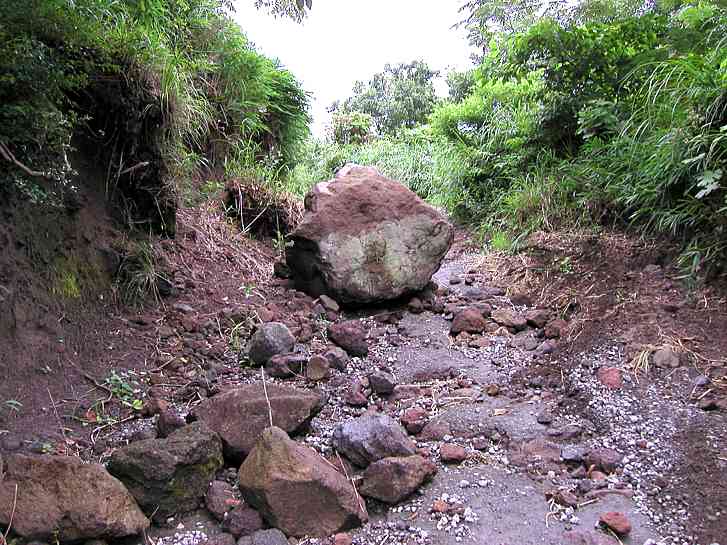 そのルートをジグザグに少し登ると こんな岩が転がっていた。 先日来の雨でなったものだろう。 さらに登って行くと、いよいよ扇山へ 入る分岐の標識がある。 ここで 10:48 高度410m 歩数14862歩 ここで浜脇から 3時間36分 |