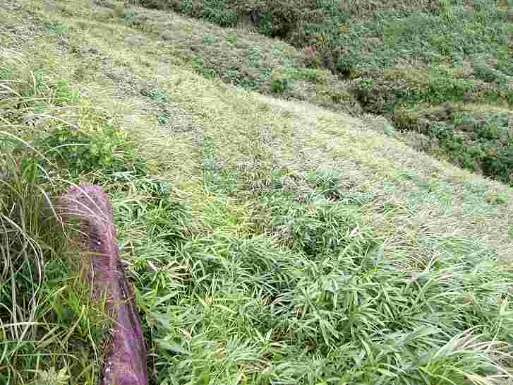 いよいよ扇山の裾野、三角形の 底辺を進むことになった。予想は していたが、草ぼうぼうで、腰まで の高さがあり、ズボンがびしょぬれ になってしまった。 あまりひどかったので用意していた スパッツと前掛けをつけて、草を掻き 分けながら進んでいった。 左の写真は裾野のほぼ終わりに近い ところである。かなりの部分がこんな 感じで、道を草が覆っている感じである |