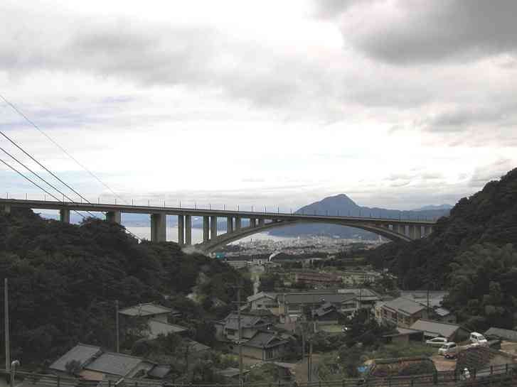 湯ノ花小屋の少し前からの写真 明礬温泉街がならび、遠く 高崎山と高速明礬橋が見える。 |
