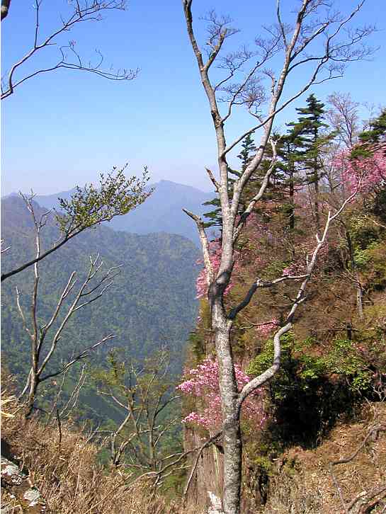 前傾手前の尾根からの眺め。 遠くに見えるのが祖母である。 アケボノツツジが満開だった。 |