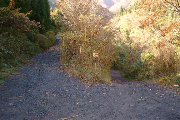 | 右の白い標識は左が登山口という | |