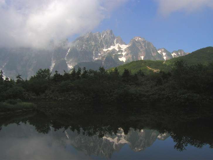 あこがれの仙人池からの 剣岳岩峰群 やや雲がかかり残念 |